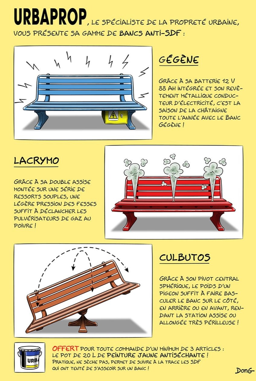 URBAPROP, l'entreprise d'aménagement urbain favorite des municipalités de droite, vous présente aujourd'hui sa gamme de « bancs anti SDF ».